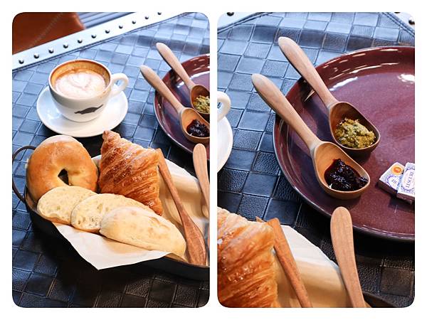 麵粉香俱樂部就是熱愛澱粉的我必點的!蜂蜜貝果、法式可頌、巧巴達三種,附上法國頂級Lescure奶油、義式青醬、店家手工熬煮果醬做搭配。Lescure奶油帶有一點鹹鹹的口感,個人最喜歡加上義式青醬很香又很有風味。